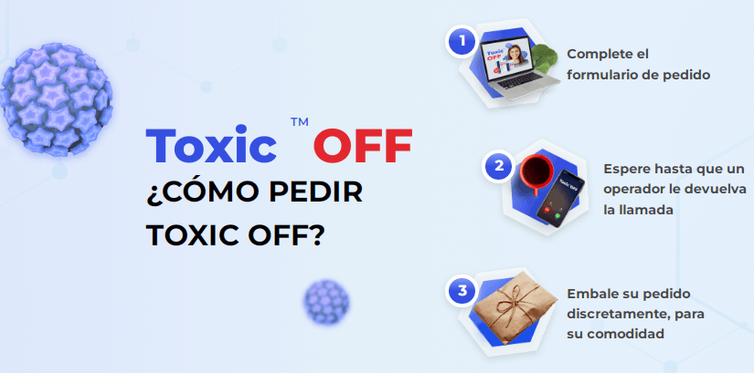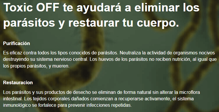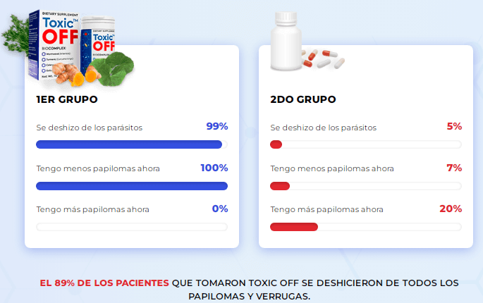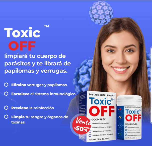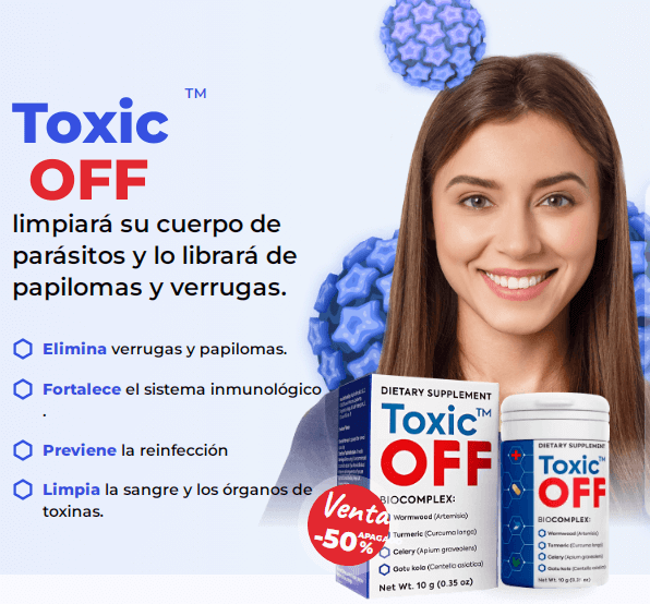 Las verrugas y los papilomas comenzaron a esparcirse por todo mi cuerpo. No me ayudaron ni los procedimientos estéticos ni los productos de farmacia. Una amiga mía me recomendó que me hiciera la prueba de parásitos y resultó ser que estaba infectada por ellos. Mi médico me recetó Toxic OFF para eliminar las lombrices intestinales, las verrugas y los papilomas al mismo tiempo. Además, Toxic OFF te da protección contra la reinfección, fortalece tu sistema inmunitario y limpia su cuerpo.